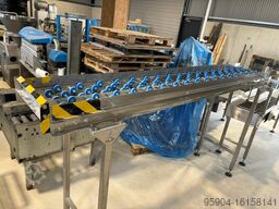 5. Napędzany przenośnik rolkowy ze stali nierdzewnej, wymiary - rolki 2200 mm dł. x 400 mm szer., z regulowaną płytą zamykającą górną skrzynkę, 2200 mm dł., w całości ze stali nierdzewnej, w komplecie z silnikiem, przekładnią, izolatorem zatrzymania/uruchomienia.